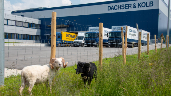 Das Team von DACHSER & KOLB hat tierische Unterstützung bekommen: Seit ein paar Tagen weiden (und „mähen“) rund um die Firmenzentrale in Kempten im Allgäu die beiden Schafe Fridolin und Boncuk.