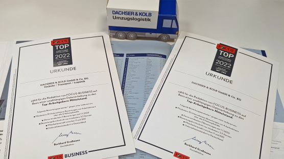 Das Ranking, welches von Focus Money und FactField GmbH durchgeführt wurde, berücksichtigt den Bewertungsschnitt aus Befragungen und Online-Bewertungen, sowie der Anzahl aller eingegangenen Bewertungen. Die Umzugsfirma DACHSER & KOLB konnte in der eigenen Branche „Verkehr/Transport/Logistik“ überzeugen und erhält dafür die Auszeichnung „Top-Arbeitgeber Mittelstand“.